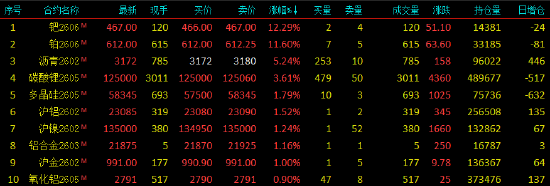 2026年1月5日,早盘开盘,国内期货主力合约涨多跌少,钯涨超12%,铂涨超11%,沥青涨超5%,碳酸锂涨超3%,多晶硅、沪铝、沪镍、铝合金涨超1%。跌幅方面,烧碱、低硫燃料油、菜粕跌超1%。